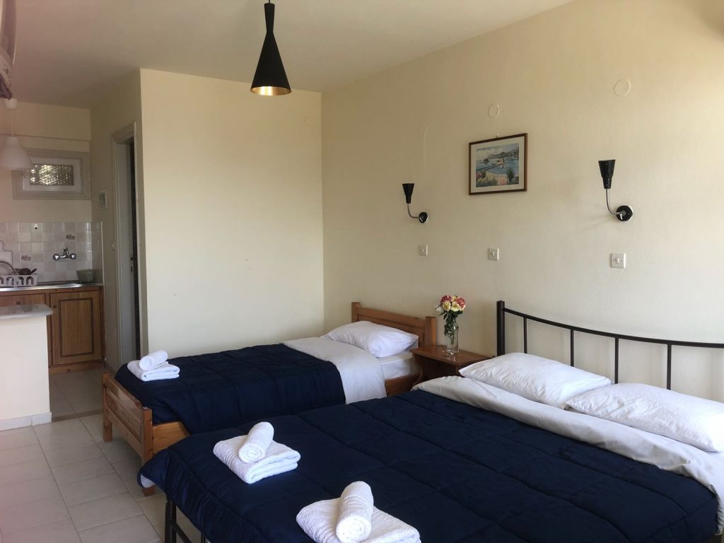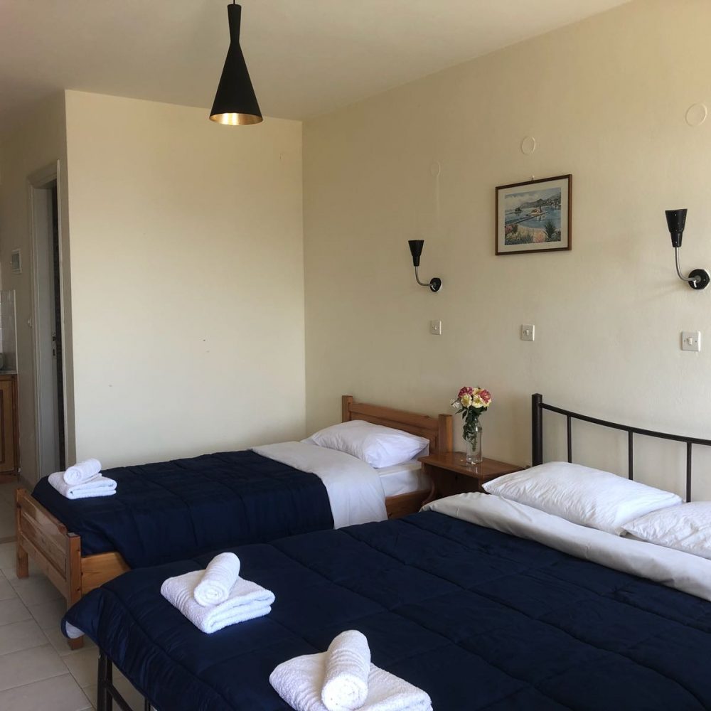 Стандартный трёхместный номер с 1 двуспальной кроватью и одной одинарной или 3 отдельными кроватями. Номер с видом на море и уютным меблированным балконом. Номер оснащен бесплатным wifi , а также кондиционером, предоставляемым бесплатно. Визуально комнату можно поделить на две половины. Первая половина это спальная зона с 1 двуспальной кроватью и одной одинарной или 3 отдельными кроватями, прикроватной тумбой, шкафом для одежды и зеркалом. Зона кухни вмещает в себя холодильник, электроплиту , имеется электрочайник и посуда. Также в номере имеется ванная- душевая комната для индивидуального пользования.