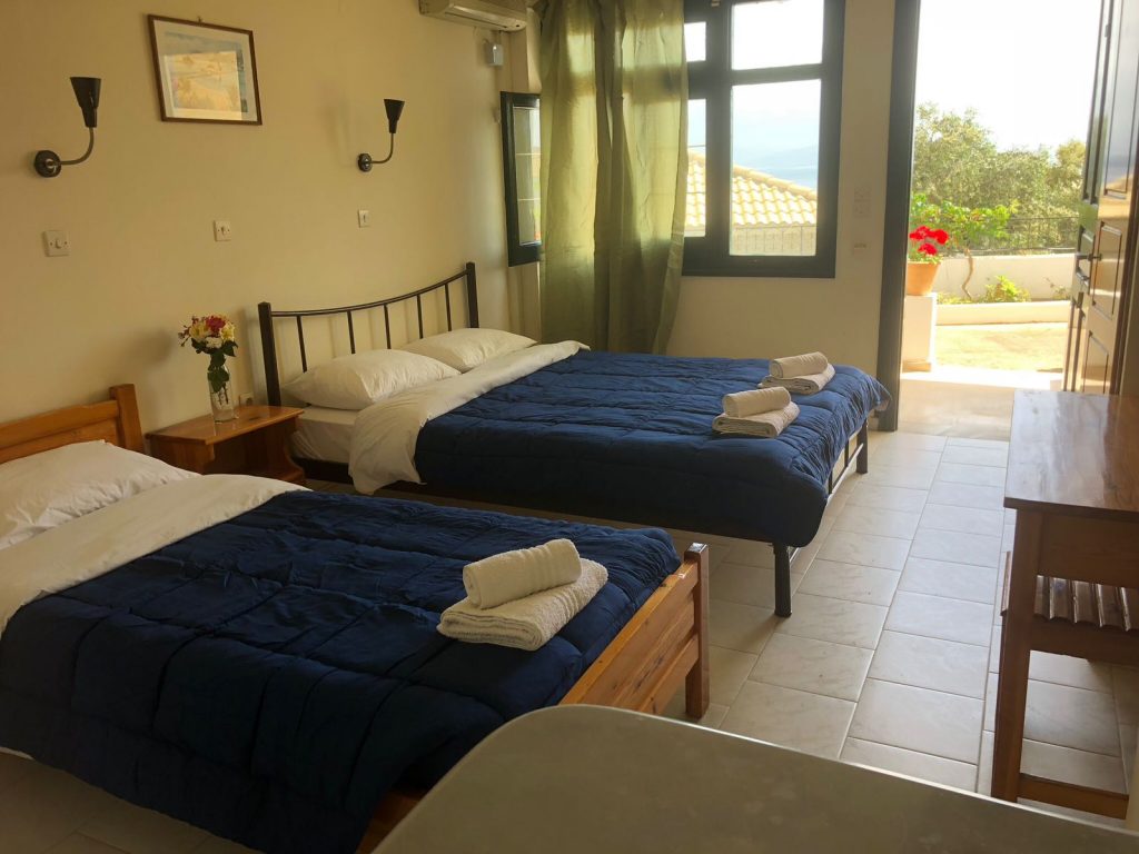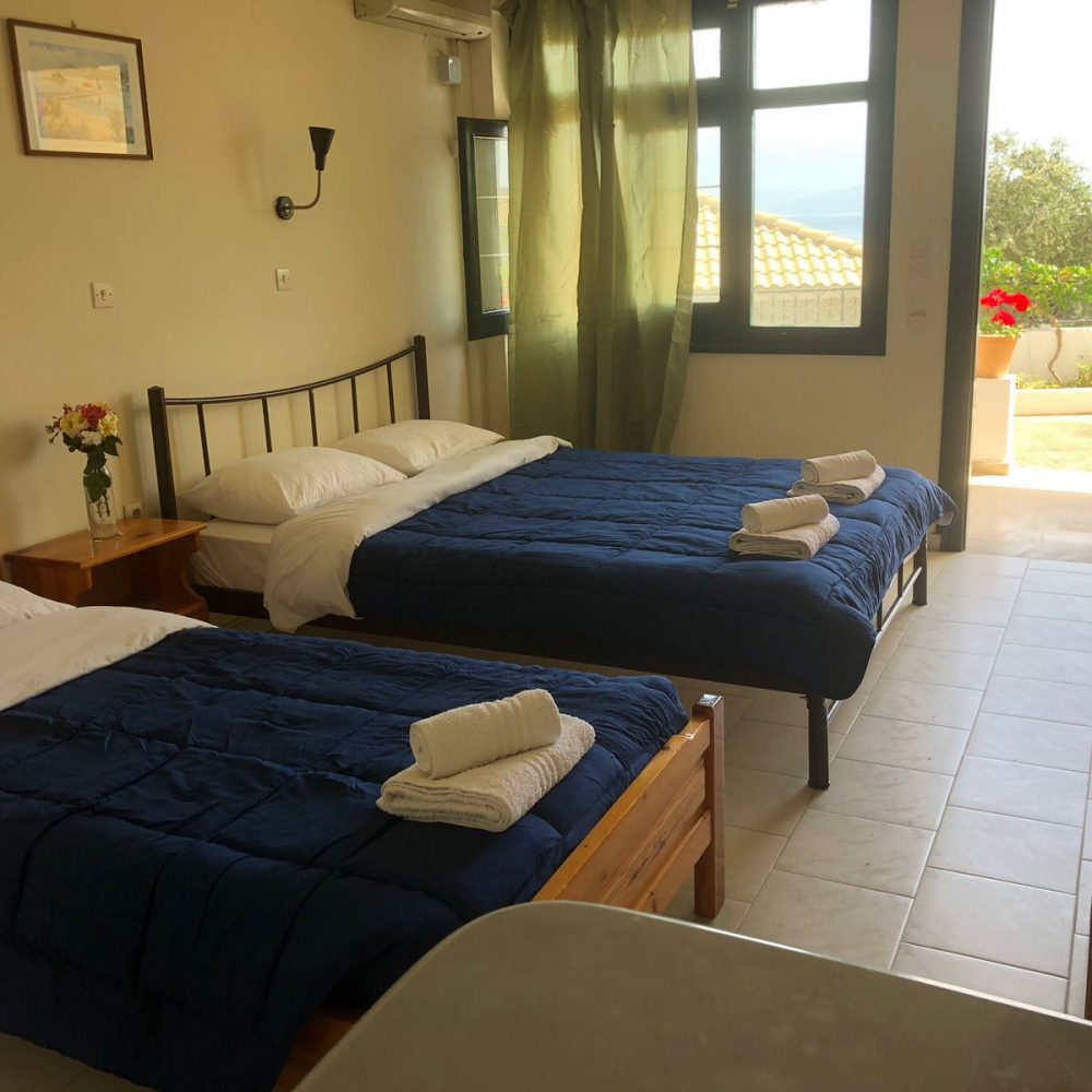 Семейный номер (на 4 человека) с 1 двуспальной кроватью и одной двухъярусной кроватью или 2 отдельными и 1 двухъярусной кроватью. Номер с видом на море и уютным меблированным балконом. Номер оснащен бесплатным wifi , а также кондиционером, предоставляемым бесплатно. Визуально комнату можно поделить на две половины. Первая половина это спальная зона с 1 двуспальной кроватью и одной двухъярусной кроватью или 2 отдельными и 1 двухъярусной кроватью, прикроватной тумбой, шкафом для одежды и зеркалом. Зона кухни вмещает в себя холодильник, электроплиту, имеется электрочайник и посуда. Также в номере имеется ванная- душевая комната для индивидуального пользования.